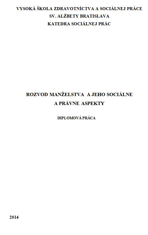 Rozvod manželstva a jeho sociálne a právne aspekty. [Diplomová práca]/- Vysoká škola zdravotníctva a sociálnej práce sv. Alžbety Bratislava; Katedra sociálnej práce Bratislava. - Školiteľ: Stupeň odbornej kvalifikácie: Magister sociálnej práce. - Bratislava: Katedra sociálnej práce, 2014. 81s.