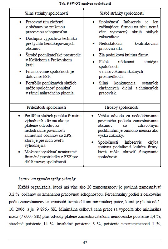 Hlavným cieľom diplomovej práce je návrh postupu zriaďovania ďalších pobočiek chráneného pracoviska spoločnosti Infoservis. Zriaďovanie nových pobočiek spoločnosti sa navrhne prostredníctvom využitia nenávratných finančných príspevkov na zriadenie pracovných miest pre zdravotne postihnutých občanov a príspevkov na úhradu prevádzkových nákladov. Na zabezpečenie lepšieho vzdelávania zamestnancov sa vedeniu spoločnosti navrhne využiť príspevok na vzdelávanie zamestnancov. Vytvorením nových pracovných miest v spoločnosti Infoservis sa vedeniu spoločnosti navrhne zmena portfólia ponúkaných služieb spoločnosti, ktoré dokáže zabezpečiť lepší rozvoj firmy. Pri vypracovaní diplomovej práce sa používajú analýzy štatistických ukazovateľov nezamestnanosti zdravotne postihnutých občanov v Košickom a Prešovskom kraji. Analýzy schém štátnej pomoci na podporu zamestnávania občanov so zdravotným postihnutím a schém štátnej pomoci na vzdelávanie zamestnancov. Na hodnotenie dosiahnutých hospodárskych výsledkov spoločnosti sa použijú vypracované strategické plány podniku. Na ich základe sa navrhne vypracovanie nového portfólia služieb, aby spoločnosť dosiahla lepšie a efektívnejšie výsledky, ktoré sa dosiahnu len kvalitným marketingovým prieskumom.
