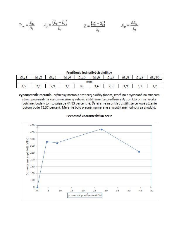 Výsledky merania statickej skúšky ťahom, ktorá bola vykonaná na trhacom stroji, poukázali na vzájomné zmeny veličín. Zistili sme, že predĺženie At , pri ktorom sa vzorka roztrhne, bude v tomto prípade 44,33 percentné. Ďalej sme napríklad zistili, že celkové zúženie potom bude 73,37 percent. Meranie bolo presné, namerané a vypočítané hodnoty sa zhodujú.