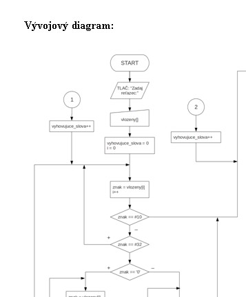 Na vstupe sa načítajú znaky zadaného reťazca. Vynulujeme si počítadlo a adresár pre vyhovujúce slová. Potom začneme načítavať znaky zo zadaného reťazca a posúvať znak po znaku, popri tom kontrolovať, či zadaný znak je náhodou ENTER (koniec načítavania reťazca) alebo MEDZEROVNÍK (porovnávanie konca reťazca ak sa nič za medzerami nenachádza program vyhodí výsledok na tlač a koniec). Program skontroluje v cykle či reťazec sa začína “0“ ak slovo nezačína žiadnym z týchto znakov tak nespĺňa podmienku. Potom sa znovu porovnáva či tam je znak ENTER alebo MEDZEROVNÍK v cykle „zlé slovo“...