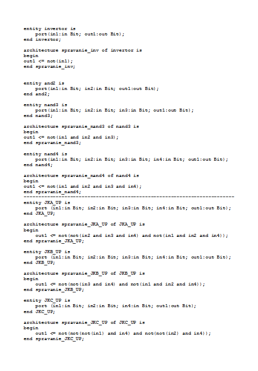 V jazyku VHDL vytvorte opis správania sa a opis štruktúry počítadla nahor/nadol od 0 do 13. Ak vstupný signál Up=“1“, počítadlo počíta nahor, inak nadol. Počítadlo má dva jednobitové výstupy Max a Min. Ak počítadlo dosiahne hodnotu 13, nastaví výstup Max na logickú úroveň „1“. Obdobne ak počítadlo dosiahne hodnotu 0, nastaví výstup Min na logickú úroveň „1“. V oboch prípadoch sa počítanie zastaví až do zmeny smeru počítania. Počítadlo sa inkrementuje/dekrementuje s dobežnou hranou hodinového signálu. Oneskorenie obvodu je 6ns (uvažujte v správaní). V opise správania sa použite príkaz process s riadiacou štruktúrou if. Opis štruktúry musí byť hierarchický až na úroveň základných logických hradiel a preklápacích obvodov (opísaných modelom správania sa). Použite J-K preklápacie obvody. Vytvorte entitu testovacích vzoriek, ktorá dostatočne otestuje navrhnuté obvody. Návrhy odsimulujte. K návrhu vypracujte písomnú dokumentáciu.