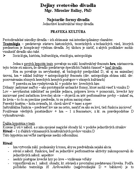 Dejiny svetového divadla, poznámky (doc. M.Ballay, phd) kulturológia. Dejiny divadla od praveku po sučasnosť, aj východne divadla, divadlo 20. storočia.