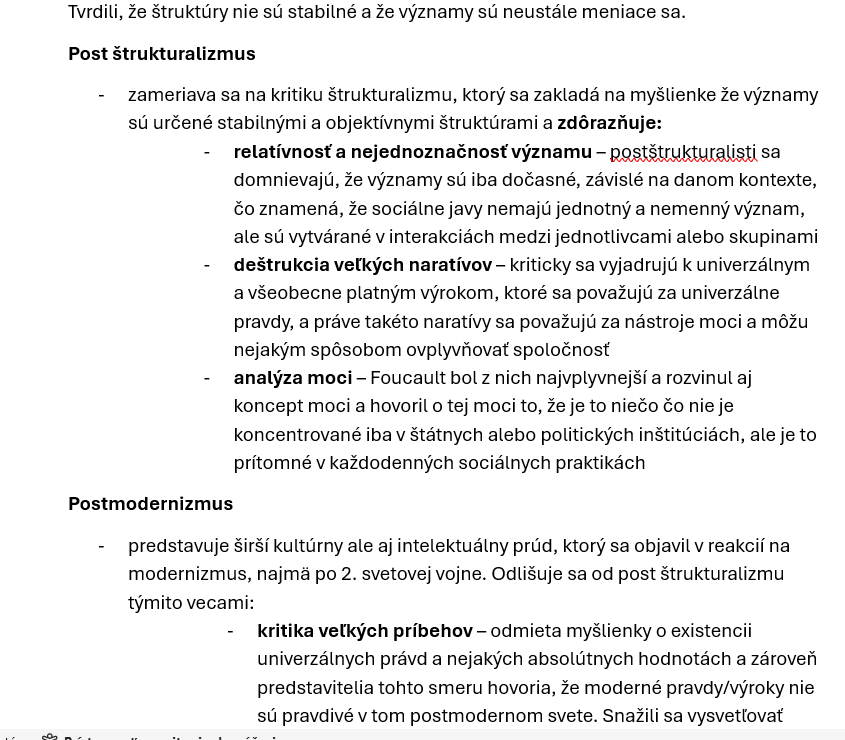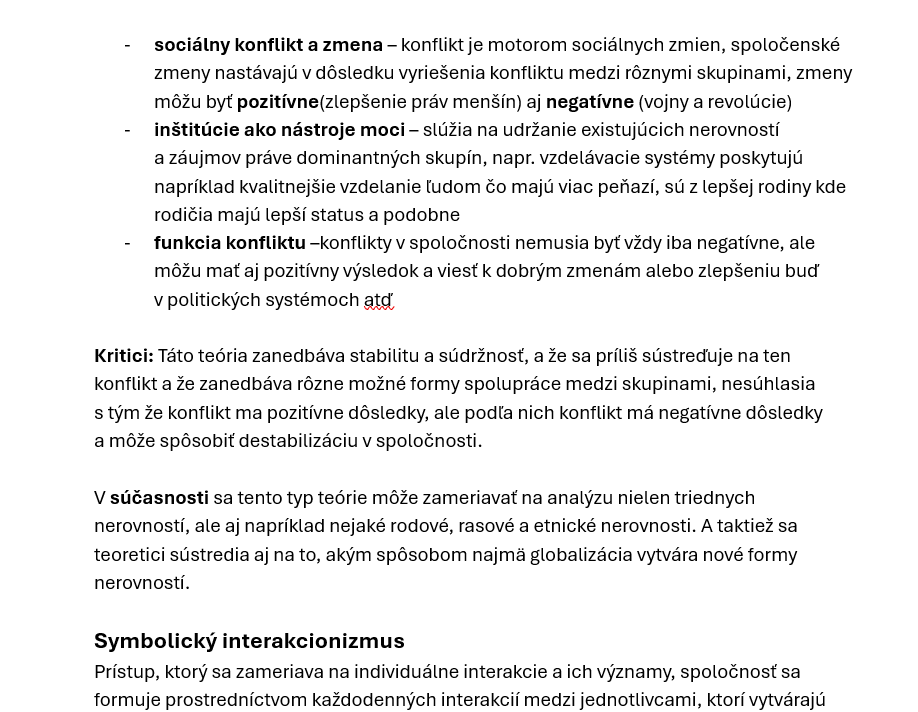 Poznámky sú štruktúrované ako prehľad definícií, charakteristík a porovnaní. Zameriavajú sa na to, čo jednotlivé teórie považujú za „jadro“ spoločenského poriadku (stabilita vs. napätie), aké mechanizmy vysvetľujú správanie jednotlivcov a skupín, a aké sú typické výskumné otázky na mikro- a makroúrovni. V texte sa objavujú aj významné osobnosti a ich prínosy (napr. klasické a neskoršie sociologické prístupy, vrátane tém sociálnej akcie, významu symbolov, nerovností a sociálnych inštitúcií).