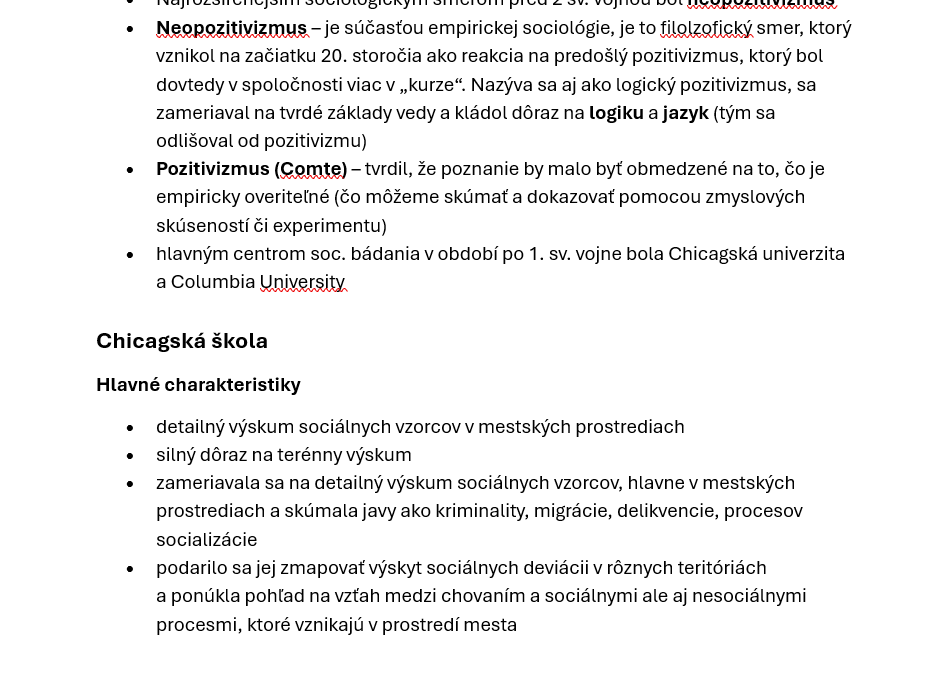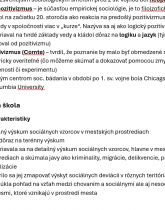 Záver materiálu sa venuje vybraným tradíciám empirického a mestského výskumu, najmä Chicagskej škole: jej inštitucionálnemu zázemiu, úlohe časopisu *American Journal of Sociology*, priekopníckym autorom a konceptom (napr. sociálna dezorganizácia, mesto ako „laboratórium“), ako aj modelom priestorového usporiadania mesta (zóny, sukcesia). Celok slúži ako kompaktný študijný podklad na priebežné opakovanie alebo prípravu na skúšku, pričom poskytuje rýchlu orientáciu v pojmoch, smeroch a základných argumentoch.