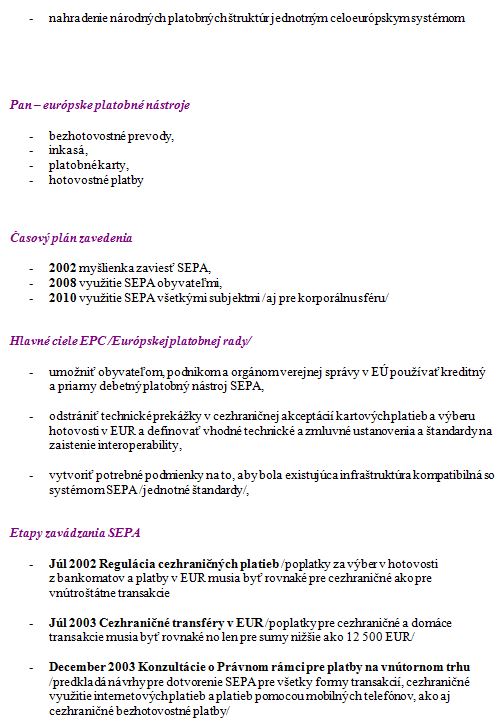 - jednotný trh platieb, na ktorom každý účastník /FO/ bude schopný uskutočňovať akúkoľvek platbu jednoducho, efektívne, bezpečne a za rovnakú cenu ako v rámci jednotlivých domácich /národných/ platobných priestorov.