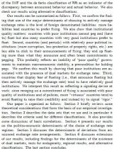 The difficulty of maintaining pegs is a well-known phenomenon. Recently, a different type of deviation from announcements has been quite common: Calvo and Reinhart (2002) show that while many countries claim to be floating, in fact they peg, experiencing what has been labeled “fear of floating.” Our goal is to identify what features of countries make them “fearful” of following through with actions what they announce in words, thus reneging on announcements of exchange rate regimes. Deviations from preannounced regimes are likely to imply increased uncertainty in currency markets, risk premia charged on liabilities issued in domestic currencies, and difficulties in conducting domestic monetary policy. We show below that different forces lead countries to announce a peg and then float and vice versa. Countries with inadequate institutions, associated with poor macroeconomic management, are incapable of holding pegs; countries with superior institutions tend to display “fear of floating,” perhaps in an attempt to signal their type. We begin by briefly reviewing the question of the choice of exchange rate regimes, that is, why certain countries choose to float or to peg. We build upon a recent literature, which includes Calvo and Reinhart (2000), Frieden et al. (2000), Hausmann, Panizza and Stein (2000), Levy-Yeyati, Sturzenegger and Reggio (2003), and Obstfeld and Taylor (2002), amongst others.1 Explaining the choice of exchange rate regimes is difficult from the start, since a classification of regimes is problematic. The IMF has traditionally produced a classification which is “de iure,” that is, it is essentially based on what the countries say that they do. For example in certain periods several countries are classified as floating even though their exchange rate never moves vis-a-vis, say, the US dollar. Various attempts have been made to adjust this classification or to offer altogether new ones. Some studies — like Ghosh et al. (1997), and Frieden et al. (2000) — adjust the IMF classification. The IMF itself has recently changed its classification (IMF 1999). Levy-Yeyati and Sturzenegger (2003) provide a classification based on data on exchange rates and international reserves. Shambaugh (2003) offers another classification based on statistical analysis of the exchange rate itself. Reinhart and Rogoff (2003) (RR) take a more radical approach: they classify regimes based upon a statistical analysis of the observed behavior of exchange rates, and consider explicitly the fact that many countries - even in the developed world - have or had dual exchange rate markets. In our analysis, we use the difference between the de iure classification.