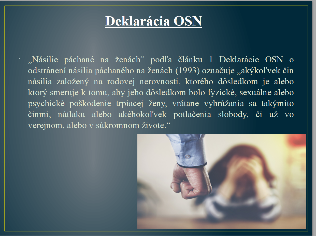 Materiál sumarizuje vybrané medzinárodné a európske rámce a projekty, ktoré sa venujú prevencii kriminality a najmä násilia páchaného na ženách. Úvod pracuje s pojmom prevencie kriminality ako cieľavedomého a koordinovaného pôsobenia na príčiny a podmienky kriminality s cieľom ich odstrániť alebo aspoň obmedziť negatívne prejavy. Následne uvádza definíciu násilia páchaného na ženách podľa Deklarácie OSN o odstránení násilia páchaného na ženách (1993), ktorá zdôrazňuje rodovo podmienený charakter násilia a jeho fyzické, sexuálne aj psychické dôsledky.