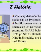 » Na Slovensku sme zatiaľ v tomto smere ešte len na začiatku. Vďaka programu PHARE bolo už v máji 1996 pri STU v Bratislave zriadené Národné stredisko pre dištančné vzdelávanie.
