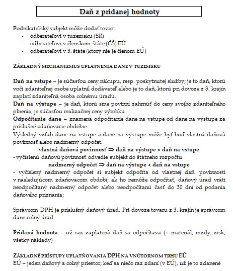 Daň na vstupe - je súčasťou ceny nákupu, resp. poskytnutej služby; je to daň, ktorú voči zdaniteľnej osobe uplatnil dodávateľ alebo je to daň, ktorú pri dovoze z 3. krajín zaplatí zdaniteľná osoba colnému úradu.