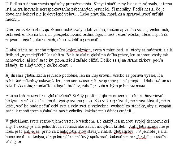 Ekonomická sila je dnes, tak ako vždy, rozhodujúca. Vojenská sila z nej rastie, je dôsledkom tej sily. Správne to rozanalyzoval R. Piško vo svojej úsmevnej poviedke, aj antiglobalisti sa musia globálne pospájať... Už v škole nás učili, že každá akcia vyvolá rovnako veľkú reakciu. Nie že by som antiglobalistov považoval za reakcionárov, to božechráň! Oni sú vlastne len druhou stranou tej istej mince, na vyváženie pomerov.