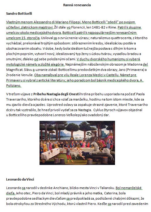 Umenie je tvorivá činnosť ľudí. Patrí k nemu architektúra, výtvarné umenie, literatúra, hudba, divadlo, tanec, film a fotografia. Pravek, antika boli pod vplyvom kultov a povier, stredovek /ranokresťanské, románske umenie, gotika/ pod vplyvom náboženstva. Postupne sa spod týchto vplyvov vymanilo /renesancia, barok, klasicizmus, romantizmus, realizmus/ a sústredilo sa na vyjadrenie skutočného sveta. Veľmi úzko súvisí s ostatnými javmi duchovného života spoločnosti /vedou, morálkou, technikou a pod./. Umenie má svoj historický vývin. Každý umelecký druh má svoje dejiny a teóriu. S umením sa stretávame na každom kroku. Je to architektúra domov na uliciach, upravené ulice vysadené stromy, kvety, pokosená tráva, úprava parkov, naaranžované výklady obchodov, vkusne oblečené a s citom nalíčené dievčatá. Obrazy a umelecké predmety doma. Umenie je pre naše potešenie, radosť a oku lahodiaca krása okolo nás.