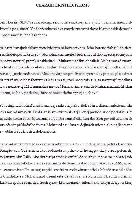 Islam je tretím najmladším monoteistickým náboženstvom. Jeho korene siahajú do šiesteho storočia nášho letopočtu, kedy sa v obchodníckom meste Mekke narodil do kupeckej rodiny kmeňa Kurajš jeho zvestovateľ, prorok a zakladateľ - Muhammad ibn Abdalláh. Muhammad znamená najviac chvályhodný alebo obdivuhodný. Niektorí nezasvätení nazývajú podľa neho toto náboženstvo aj ,,mohamedánstvo“. Moslimovia proti používaniu týchto slov protestujú a odmietajú ich. Teda pravé meno ich náboženstva je islam a tí, ktorí ho vyznávajú, sa nazývajú moslimami. Moslimovia neuctievajú Muhammada a naviac Moslimovia neveria, že Muhammad založil islam, aj napriek tomu, že ho v poslednej fáze náboženského vývoja uchoval.