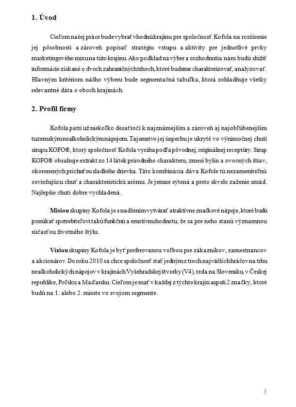 Cieľom našej práce bude vybrať vhodnú krajinu pre spoločnosť Kofola na rozšírenie jej pôsobnosti a zároveň popísať stratégiu vstupu a aktivity pre jednotlivé prvky marketingového mixu na túto krajinu. Ako podklad na výber a rozhodnutia nám budú slúžiť informácie získané o dvoch zahraničných trhoch, ktoré budeme charakterizovať, analyzovať. Hlavným kritériom nášho výberu bude segmentačná tabuľka, ktorá zohladňuje všetky relevantné dáta o oboch krajinách.