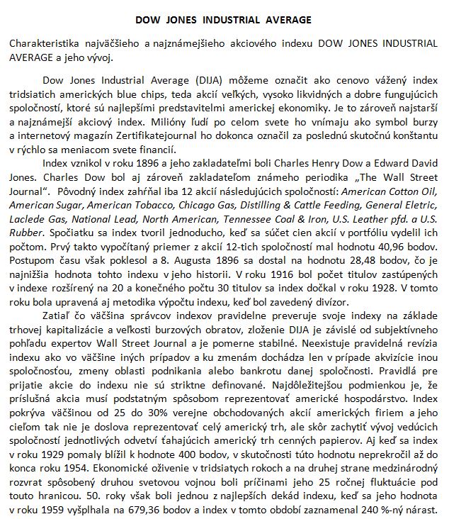 Charakteristika najväčšieho a najznámejšieho akciového indexu DOW JONES INDUSTRIAL AVERAGE a jeho vývoj.