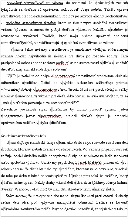 Realita je taká, že bežná právnická prax v prevažnej miere zveruje dieťa do výhradnej starostlivosti matky. Ako keby matky boli od prírody predurčené byť lepšími vychovávateľmi, ako keby boli schopné poskytnúť dieťaťu viac lásky, svojho času, bezpečia...