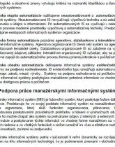 Informačné systémy predstavujú v 2'. storočí súčas: každodenného života. Ich hlavnou úlohou je zjednodušovať prácu s údajmi, pripadne celkom nahradiť prácu Človeka s dátami. Kec však informačné systémy budeme chápať v širšom ponímaní ako prostnedok prinášajúci bázu dôležitých informácií, je hlavnou úlohou informačného systému automatizoval zbieranie dôležitých, presných, včasných, úplných a správnych informácií, ktoré následne spracuje a vo vhodnej forme sprostredkúva konečnému užívateľovi. Informácie vo svojom veľkom objeme a nie vždy v zodpovedajúcej kvalite nás sprevádzajú na každom kroku. Problém ich kvantity a kvality pre.bežného konzumenta" nie je až taký zavažný, pretože zväčša si sám nenákladne zvolí, po ktorých informáciách chce vôbec siahnuť. Problematické sú však niektoré oblasti pracovného života, kde informácie hrajú kľúčovú rolu a získanie týchto informácií významnou nákladovou položkou. K takýmto pozíciám zaraďujeme aj prácu manažéra, ktorý informácie nutne potrebuje ako nevyhnutnú podporu pre korektné rozhodovanie a exekúciu rozhodnutí v daných podmienkach. V súvislosti s manažérmi sa ustálilo viacero typov informačných systémov, ktoré uľahčujú ich prácu a pnnášajú do ich konaniu nový kvalitatívny rozmer.Vo svojej práci sa chcem venovať tejto problematike, pretože vhodné a primerane nákladovo náročné informácie dokážu priniesť obrovský úžitok. Pri identifikácií potrebných informácií nám v súčasnosti pomáhajú informačné systémy, ktoré okrem iného informácie spracujú a