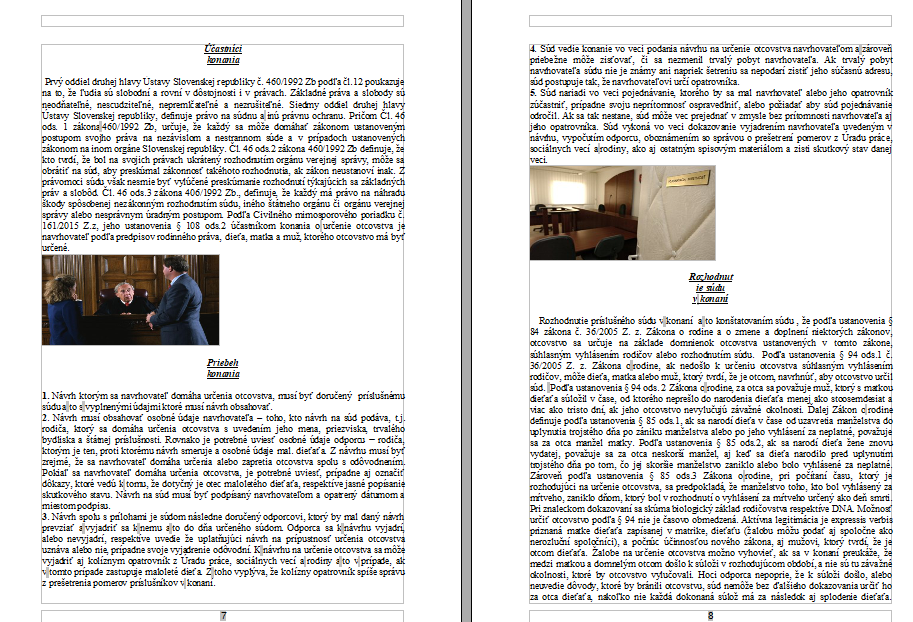 Materiál spracúva postup pri určení otcovstva rozhodnutím súdu v situácii, keď nie je možné využiť prvú domnienku otcovstva (manžel matky) ani určenie otcovstva súhlasným vyhlásením rodičov. V úvode vysvetľuje tri zákonné domnienky otcovstva podľa zákona o rodine a uvádza, kedy prichádza do úvahy súdne určovanie otcovstva. Zároveň poukazuje na význam registrácie rodičovstva, na práva dieťaťa a na rozdiel medzi administratívnym zápisom na matrike a sporovým dokazovaním pred súdom.
