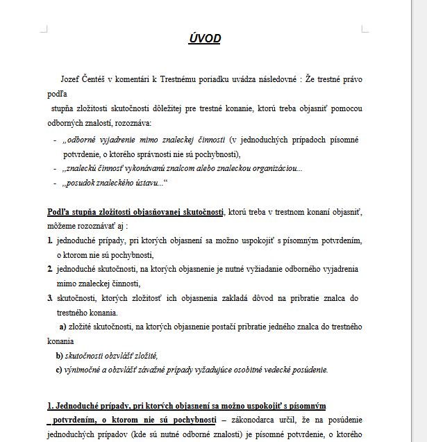 Práca vysvetľuje, ako sa v trestnom konaní využívajú odborné znalosti pri dokazovaní a aké sú rozdiely medzi písomným potvrdením, odborným vyjadrením mimo znaleckej činnosti a znaleckým posudkom. Ťažisko je na kritériu zložitosti objasňovanej skutočnosti, od ktorého závisí, aký procesný nástroj orgán činný v trestnom konaní alebo súd zvolí.