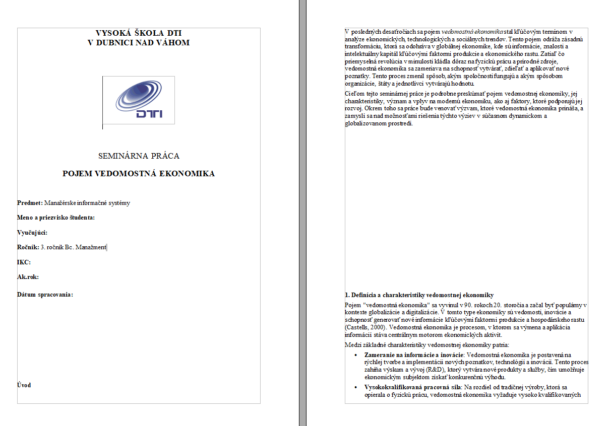 Seminárna práca sa zaoberá pojmom vedomostná ekonomika ako jedným z kľúčových konceptov súčasného hospodárskeho vývoja. Text vysvetľuje prechod od tradičnej priemyselnej ekonomiky k ekonomike založenej na vedomostiach, informáciách a inováciách, ktoré sa stávajú hlavnými faktormi ekonomického rastu a konkurencieschopnosti. Pozornosť sa venuje úlohe intelektuálneho kapitálu, schopnosti vytvárať a aplikovať nové poznatky a významu technologického pokroku.