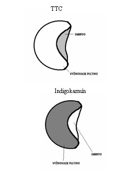 PRINCÍP: Pri chemickej detekcii životaschopnosti semien rastlín využívame chemickou reakciou spôsobené zmeny zafarbenia hlavných častí semien. 2,3,5-trifenyltetrazólium chlorid (TTC) je živými bunkami embrya dehydrogenázovou aktivitou redukovaný na formazán, ktorý sa prejavuje červeným zafarbením. Indigokarmín je prírodné tmavomodré farbivo s veľkou molekulou. Živé bunky embrya s nepoškodenými biologickými membránami nie sú schopné prijať indigokarmín a tak sa nefarbia.