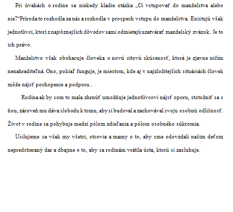 Okolo rodiny vzniklo a existuje celé klbko rôznych mravných problémov. V súčasnosti je viac a viac stredobodom pozornosti celej spoločnosti. Predovšetkým doterajší historický vývoj potvrdzuje, že rodina predstavuje optimálnu formu reprodukcie ľudstva a vzájomného súžitia pohlaví. Historické ustanovenie rodiny teda chápeme ako morálny pokrok, ako vznik novej mravnej hodnoty. Kresťanská cirkev dokonca prehlásila rodinu za sviatosť. Rodina je nevyčerpateľným žriedkom citu, úcty, lásky, altruizmu. Obohacuje ženu i muža. Rodina je tam, kde sa rodi čosi nové. Kde sa rodia veľké skutky, kde ochota a úcta muža voči žene je naplnená zdravou komunikáciou a prevažuje potreba milovať pred potrebou byť milovaný. Poskytuje, pokiaľ je zdravá, zdravý rozvoj detí. Rodina, je miesto, kde sa vracajú deti z internátu s nádejou, že mama nielen čosi dobré navarí, ale kde sa stretnú aj s láskavým otcom a so svojimi súrodencami. Je to miesto, kde aj starká vie, že je milovaná i keď nedovidí ani na krajec chleba a rozleje podaný pohár vody. Rodina to je poriadok, spravodlivosť a obeta, kde všetci členovia vnášajú kvalitnejšie vzťahy, kde si vážia jeden druhého a pretekajú sa v láske a v robení dobra. Ľudstvo nemá dôvod túto oázu istoty mravných hodnôt odmietnuť.