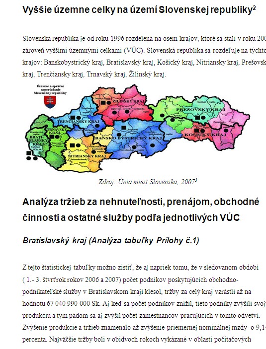 Cieľom tejto seminárnej práce je zhrnúť a zosumarizovať tržby za obchodno.podnikateľské služby, ktoré predstavujú činnosti v oblasti nehnuteľností, prenájom strojov a prístrojov (lízing), počítačové služby, informačné služby a iné obchodné služby, podľa vyšších územných celkov Slovenskej republiky.