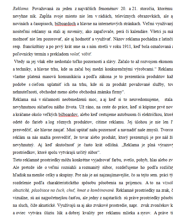 Vtedy sa jej však ešte nedostalo toľko pozornosti a slávy. Začalo to až rozvojom ekonomiky a techniky, a hlavne trhu, kde sa začal boj medzi konkurenčnými výrobcami.“ Reklama je vlastne platená masová komunikácia a podľa zákona je to prezentácia produktov každej podobe s cieľom uplatniť ich na trhu, kde sú za produkt považované služby, tovar, nehnuteľnosti, obchodné meno alebo obchodná známka firmy“.