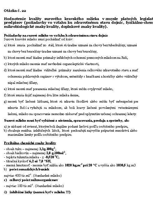 22. Hodnotenie kvality surového kravského mlieka v zmysle platných legislatívnych predpisov (požiadavky vo vzťahu ku zdravotnému stavu dojníc, fyzikálno-chemické a mikrobiologické znaky kvality, doplnkové znaky kvality).