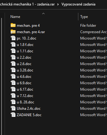 Obsah archívu naznačuje, že materiál pokrýva viacero častí kurzu technickej mechaniky, pričom jednotlivé úlohy sú rozdelené do blokov s označeniami 1.x až 10.x. Nachádzajú sa tu pôvodné zadania v priečinku „Radus“ a zároveň aj priečinok „Vypracované zadania“, ktorý pravdepodobne obsahuje riešené príklady, pomocné výpočty alebo hotové postupy k vybraným úlohám. Takéto usporiadanie je praktické pri samostatnom štúdiu, pretože umožňuje porovnávať zadanie s vypracovaním a precvičovať si riešenie konkrétnych príkladov podľa číslovania.
